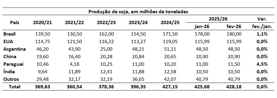 A Tabela apresenta os dados de produção mundial de soja e por país produtor, em milhões de toneladas, segundo dados do USDA, revisados em fevereiro de 2026.