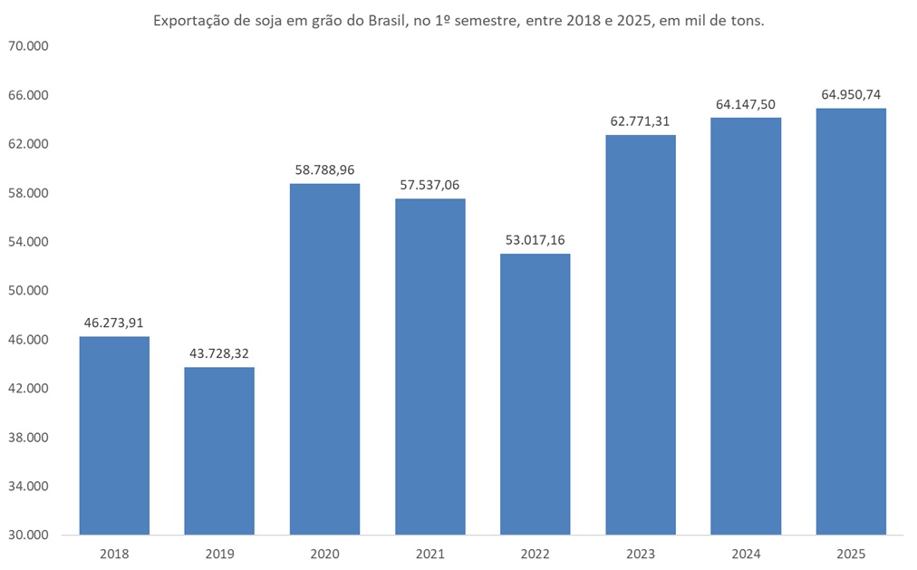 A Figura apresenta os dados de exportação de soja em grão do Brasil, entre janeiro e junho, em mil toneladas, segundo dados da COMEX, entre 2018 e 2025.