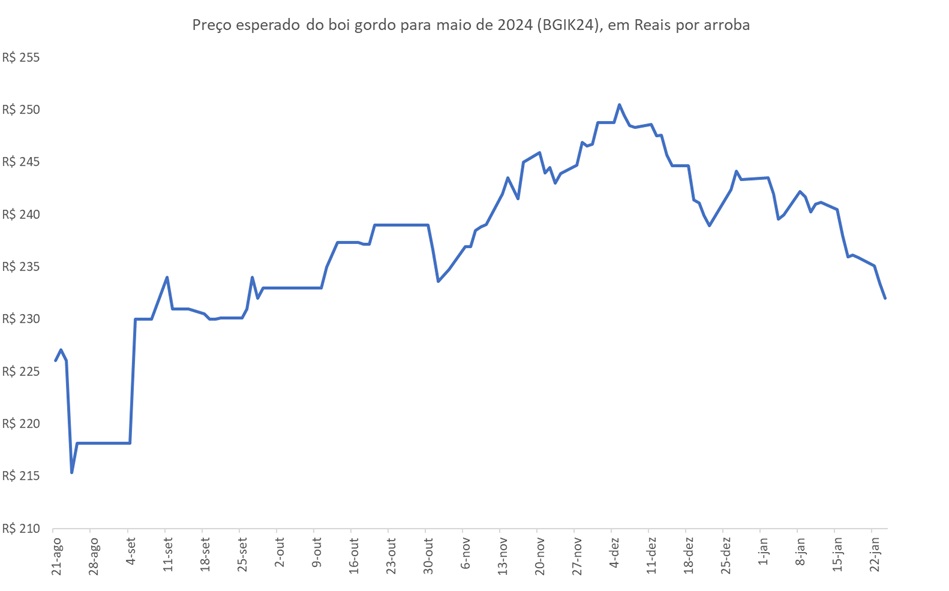 O preço esperado do boi gordo para vencimento em maio de 2024, por exemplo, caiu 4,7% na parcial de janeiro (24), com o preço cotado a R$232,0 por arroba, o menor patamar desde outubro, como mostram os dados da segunda Figura.