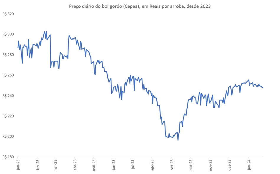 O preço do boi gordo vem apresentando preços relativamente estáveis ao longo de janeiro de 2024, com variação negativa de 1,7% na parcial do mês.