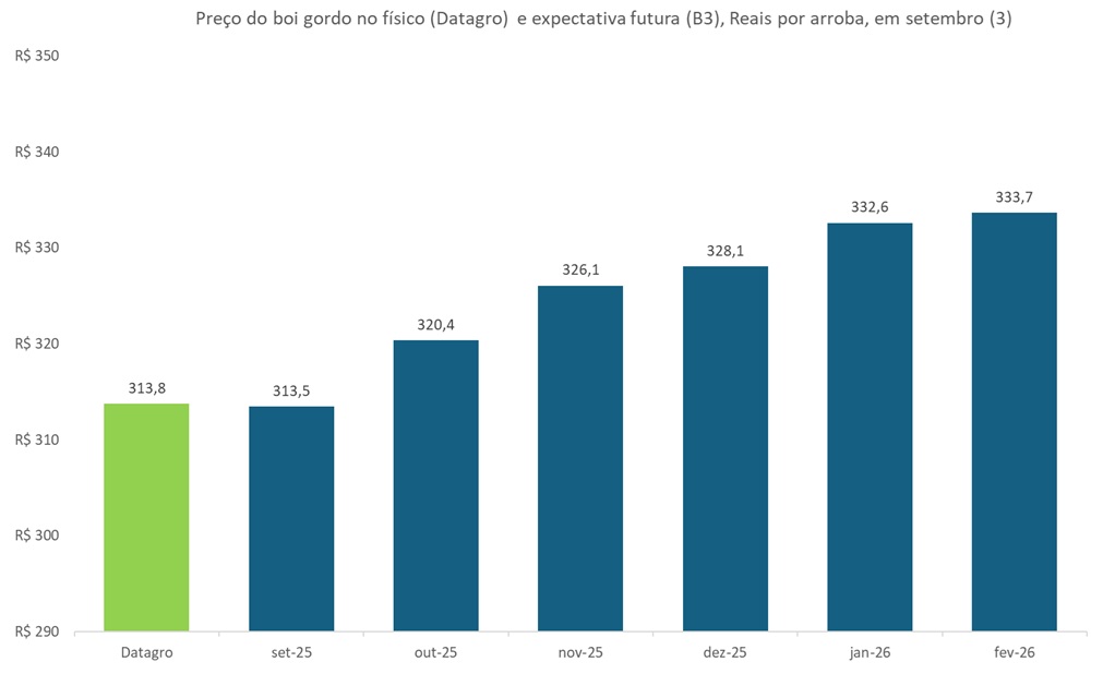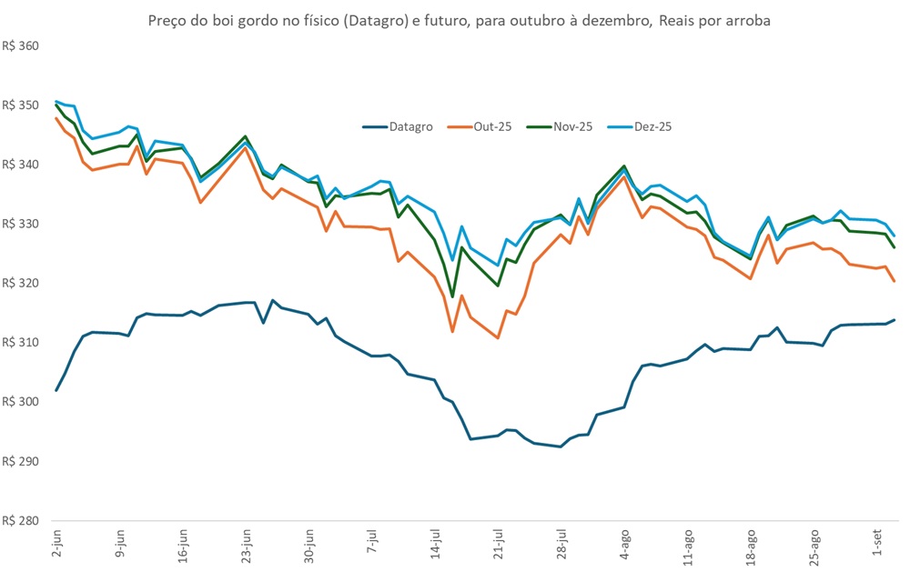 Os vencimentos para outubro, novembro e dezembro de 2025 precificam, nessa ordem, alta de apenas R$6,6, R$12,3 e R$14,3 por arroba frente a referência no físico (Datagro) em setembro (3).