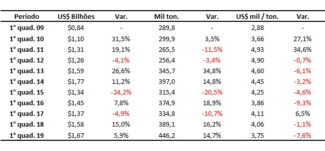 Apesar dos embarques recorde no 1° quadrimestre de 2019, a exportação de carne bovina do Brasil em relação ao faturamento foi inferior ao valor observado no mesmo período de 2014.