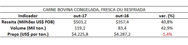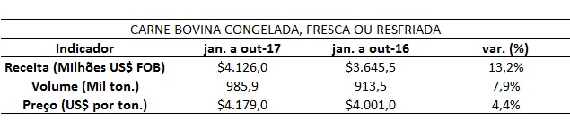 Já a Tabela a seguir compara os dados do mercado de exportação de carne bovina em outubro com os valores observados no mesmo período do ano passado (outubro de 2016).