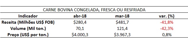 Contudo, a exportação de carne bovina apresentou dados significativamente menores quando comparado ao mês anterior (março de 2018), como destaca a Tabela abaixo.