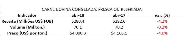 Em abril de 2018 o Brasil exportou US$280,4 milhões em carne bovina, valor 4,2% menor que o faturamento observado no mesmo período de 2017 (US$292,6 milhões). Com relação aos embarques, o País exportou 70,1 mil toneladas em abril de 2018, enquanto em abril de 2017 a exportação de carne bovina somou 70,2 mil toneladas (valor 0,2% inferior).