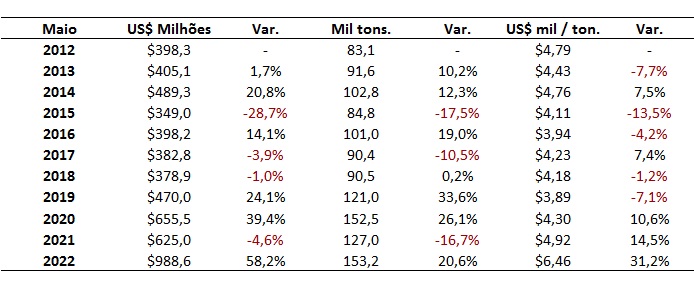 A Tabela a seguir apresenta os dados de exportação de carne bovina do Brasil nos meses de maio, entre 2012 e 2022, segundo MDIC-SECEX.