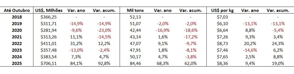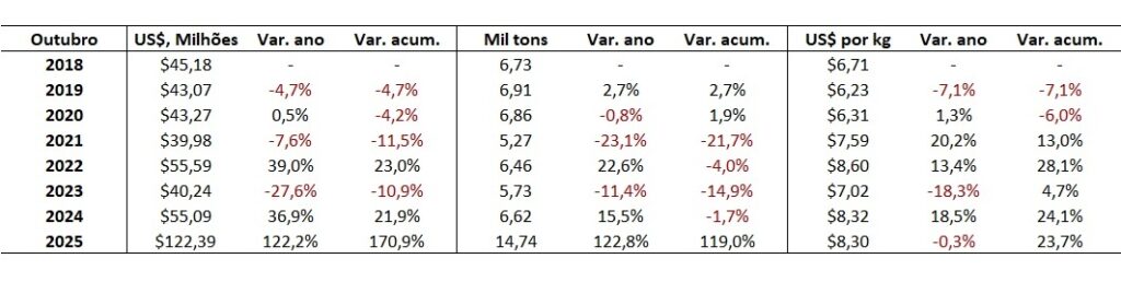 No acumulado de 2025, até outubro, o embarque de carne bovina brasileira para a UE subiu quase 70,0% frente ao mesmo período de 2024 somando 84,46 mil toneladas (segunda Tabela).