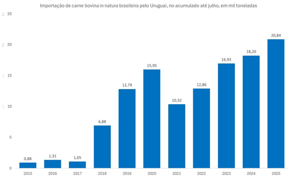 A exportação de carne bovina do Brasil para o Uruguai, entre janeiro e julho de 2025, somou 20,84 mil toneladas, alta de 14,5% frente ao mesmo período de 2024 e o maior patamar para o período do ano.