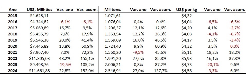 A Tabela apresenta os dados anuais de exportação de carne bovina in natura do Brasil entre os anos de 2015 e 2024, segundo dados da COMEX.