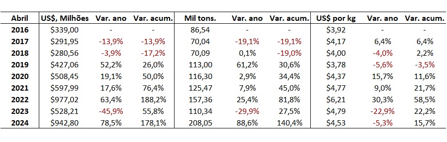 A Tabela a seguir apresenta os dados de receita, embarque e preço da carne bovina exportada pelo Brasil, nos meses de abril, entre 2016 e 2024, segundo dados da COMEX.