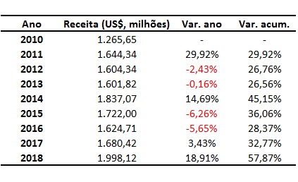 A Figura abaixo melhor ilustra a evolução da receita com a exportação de farelo de soja do Brasil nos primeiros 4 meses de cada ano, de 2010 a 2018.