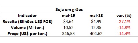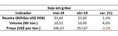 No mês de abril de 2019 a receita com a exportação de soja em grão do Brasil foi de US$3,60 bilhões e os embarques de 10,06 milhões de toneladas. Desse modo, os valores de maio de 2019 foram, respectivamente, 1,1% e 4,6% superiores em relação aos valores observados em abril de 2019.