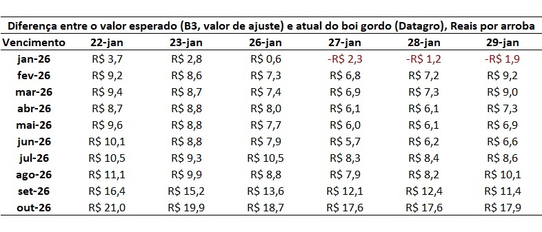 A Tabela apresenta os dados da diferença entre o valor de ajuste (B3) para os contratos com vencimento entre janeiro e outubro de 2026 em relação ao físico (indicador Datagro), em Reais por arroba, entre os dias 22 e 29 de janeiro.
