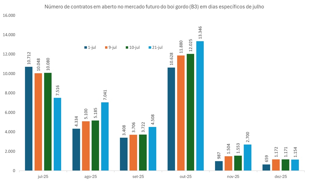 A Figura apresenta dados do número de contratos em aberto no mercado futuro do boi gordo (B3), conforme vencimento, em dias específicos de julho.