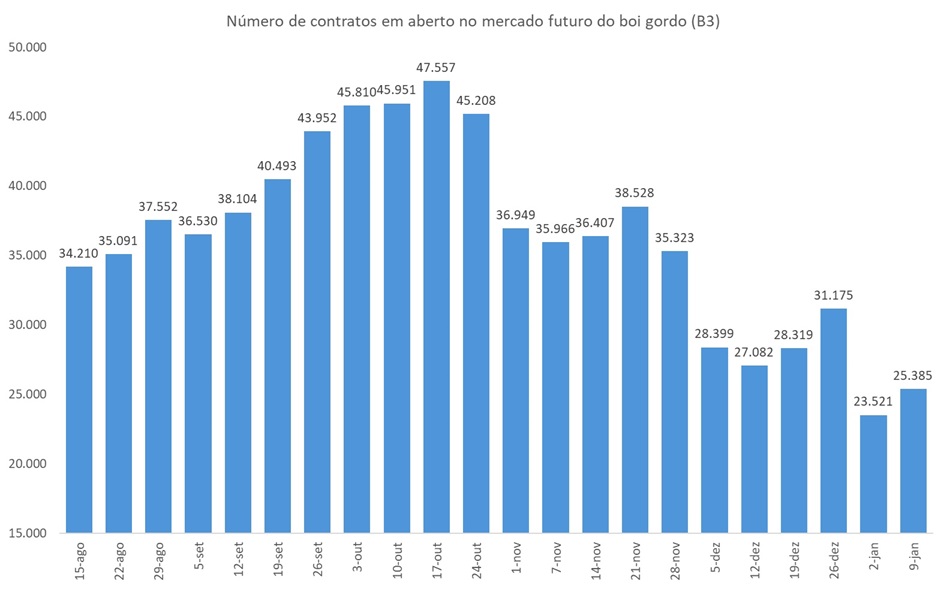 A Figura apresenta o número de contratos futuros do boi gordo em aberto até o dia 9 de janeiro de 2025, segundo dados da B3.