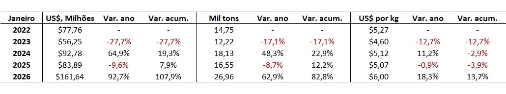O embarque de janeiro de 2026 somou 119,88 mil toneladas métricas, valor 31,5% acima do observado no mesmo período de 2025 e acima do recorde anterior para o período do ano, de 2023 (98,86 mil toneladas).