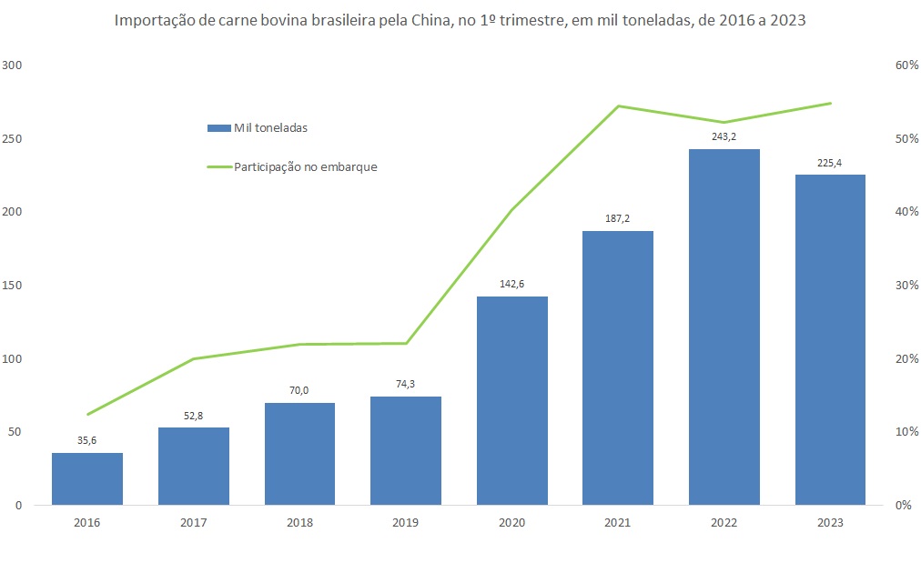 A Figura ilustra a importação chinesa de carne bovina do Brasil, no 1º trimestre, em mil toneladas e, a respectiva participação do país asiático no embarque total de carne bovina, entre 2016 e 2023.