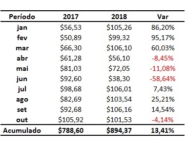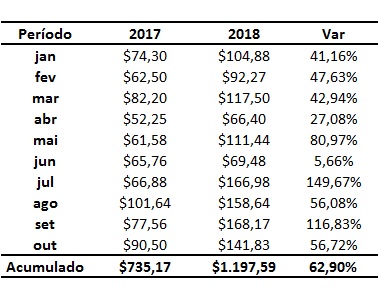 O importante é destacar também em que todo mês de 2018, até outubro pelo menos, as compras foram maiores em relação ao mesmo período do ano anterior.
