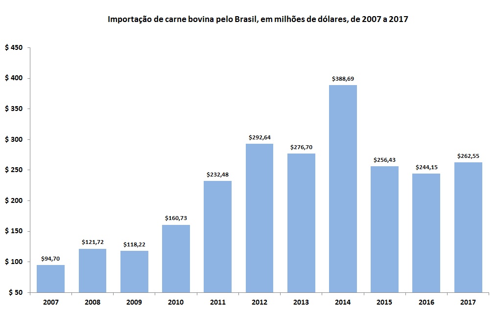 A importação de carne bovina pelo Brasil evoluiu ao longo da última década. Isso porque em 2007 o País importava o equivalente a US$94,70 milhões em carnes e no ano de 2017 importou US$262,55 milhões, um crescimento acumulado de 177,2% até 2017.