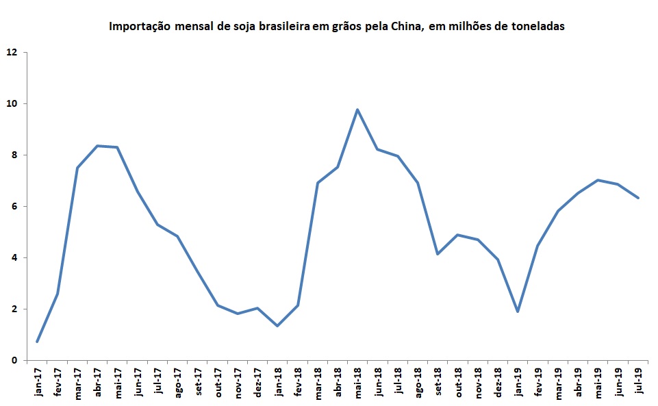 Vale destacar, nesse sentido, que no acumulado do ano, até julho, a compra de soja brasileira pela China caiu 22,0%, passando de US$17,56 bilhões entre janeiro e julho de 2018 para US$13,69 bilhões no mesmo período de 2019 (clique aqui).