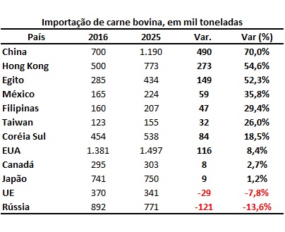 A China, Hong Kong e o Egito são os únicos países onde o crescimento esperado das importações de carne bovina devem superar os 50% até o ano 2025.