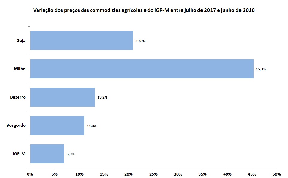 No acumulado dos primeiros 6 meses de 2018 o IGP-M acumula alta de 5,4%, enquanto o boi gordo e o bezerro acumulam queda de 4,5% e 5,5%, respectivamente,no mesmo período. Por outro lado, o milho e a soja apresentaram variação positiva e acima da inflação medida pelo IGP-M no 1° semestre de 2018, acumulando alta de, respectivamente, 9,5% e 18,4%.