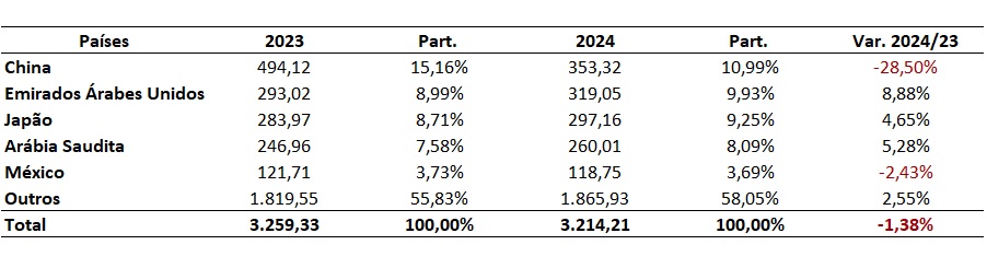 Além da China, o México também diminui a importação de frango do Brasil na parcial de 2024 (Tabela), enquanto os demais principais compradores, Emirados Árabes Unidos, Japão e Arábia Saudita aumentaram o ritmo de compra.