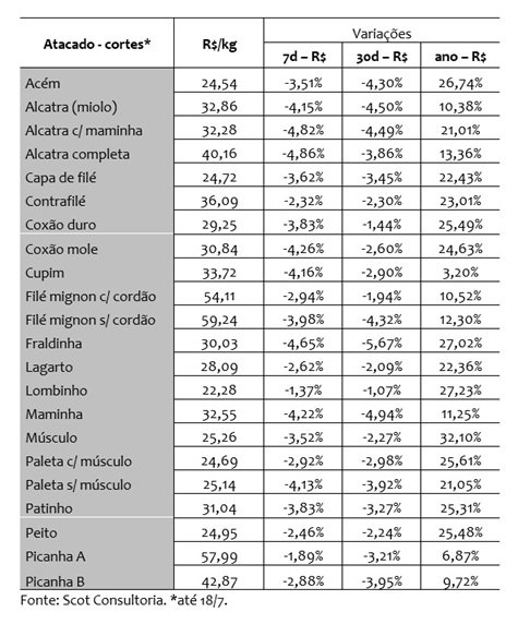 A Tabela apresenta os dados do preço médio dos cortes no atacado, em julho, média até o dia 18 e, a respectiva variação semanal, mensal e anual.