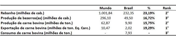 A Tabela a seguir destaca alguns dados da pecuária nacional e sua respectiva participação e rank frente ao mercado de pecuária de corte mundial no ano de 2018.