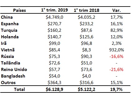 O destaque positivo dentre os principais países importadores de soja do Brasil fica para a China que aumentou em 17,7% o ritmo de compras no 1°trimestre de 2019 frente ao 1° trimestre de 2018.