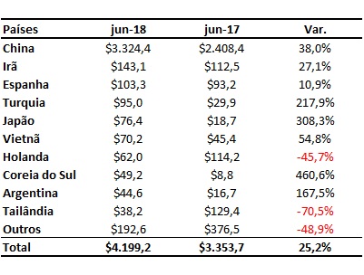 A Tabela a seguir destaca os dados de compra, em milhões de dólares, por país comprador em junho de 2018 e junho de 2017, segundo dados do MDIC.