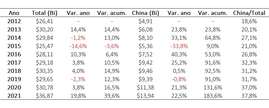 A participação da China no agro do Brasil, em termos de importância da receita de exportação, variou de 18,6% em 2012 para 37,8% em 2021 (Tabela).