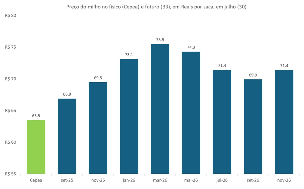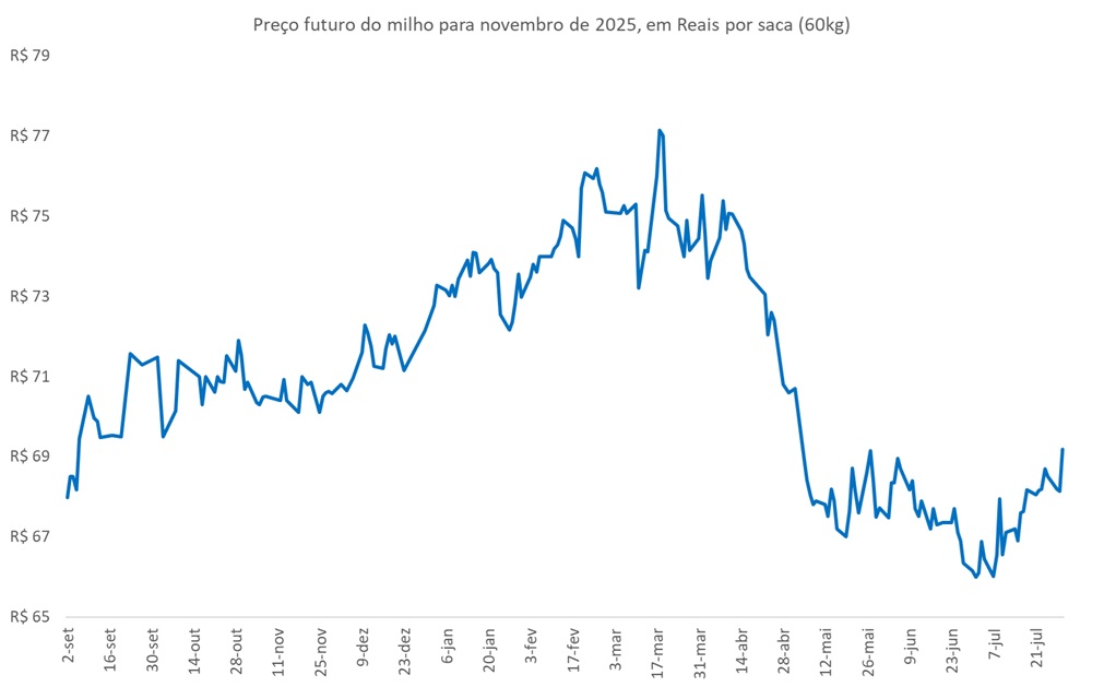O perspectiva do preço do milho segue mais otimista no final de julho, com o vencimento para novembro de 2025 voltando a se aproximar de R$70,0 por saca.