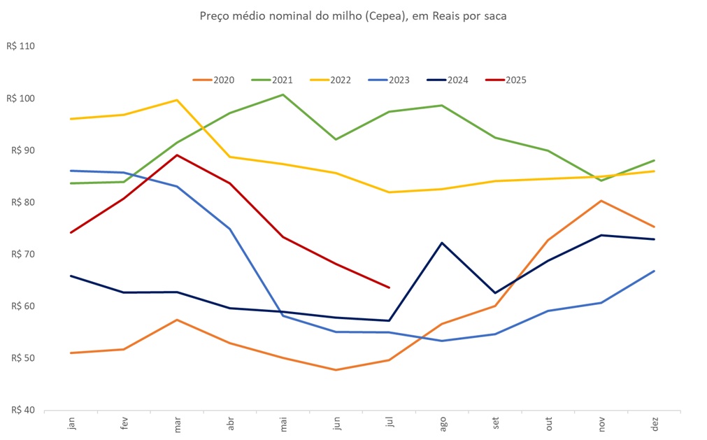 Apesar do preço do milho acumular queda no mês de julho frente ao valor que encerrou junho e também frente ao último preço de 2024, a cotação mostrou recuperação desde a mínima do ano, quando ainda em julho foi negociado a R$62,7 por saca.