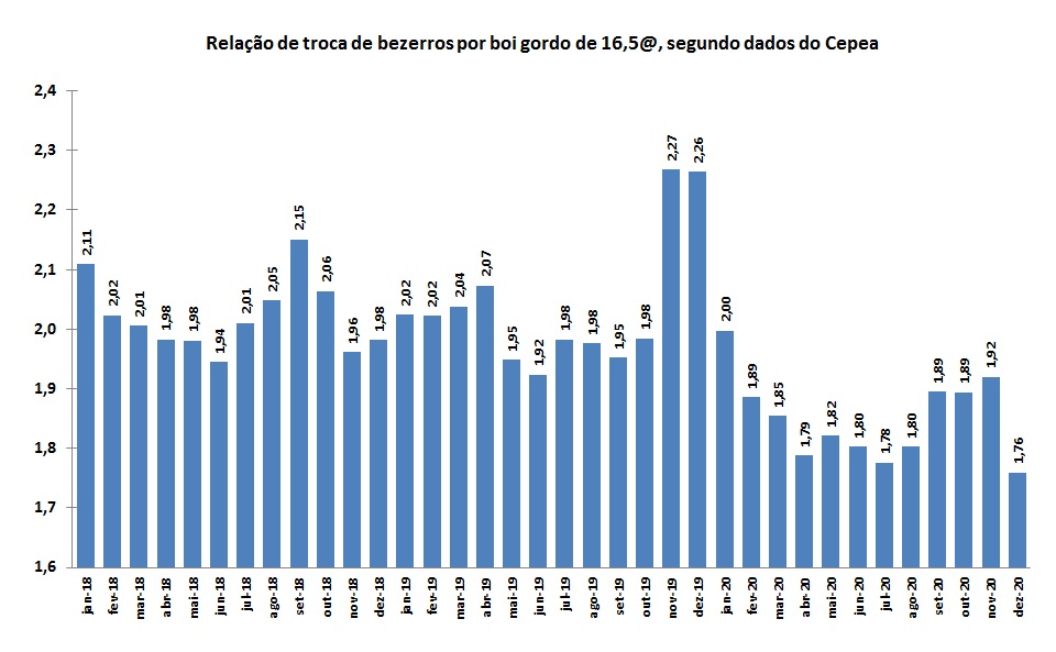 Pois é, a relação de troca de bezerros por boi gordo em dezembro (até o dia 21) de 1,76 foi 22,3% menor que o valor praticado em dezembro de 2019 (2,26 bezerros por boi gordo de 16,5@).