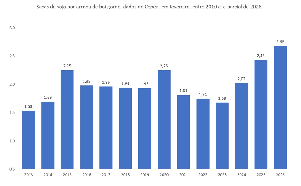 O indicador de que mede o potencial de compra da soja com uma arroba de boi gordo alcançou o maior patamar para um mês de fevereiro, em 2026.