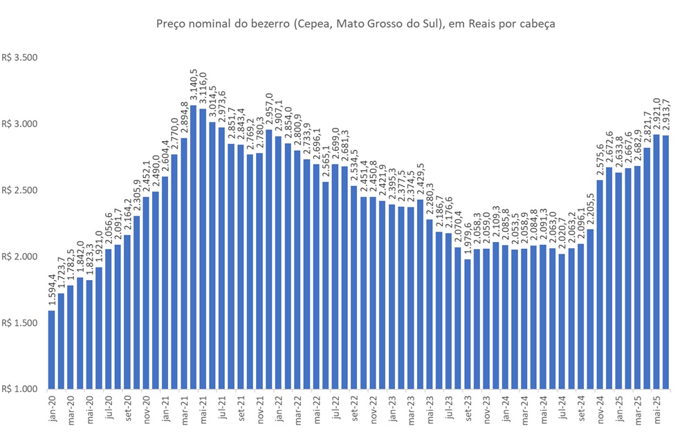 A Figura a seguir ilustra a evolução mensal do preço médio nominal do bezerro (Cepea, Mato Grosso do Sul), em Reais por cabeça, entre janeiro de 2010 e a parcial de junho de 2025 (até o dia 10).