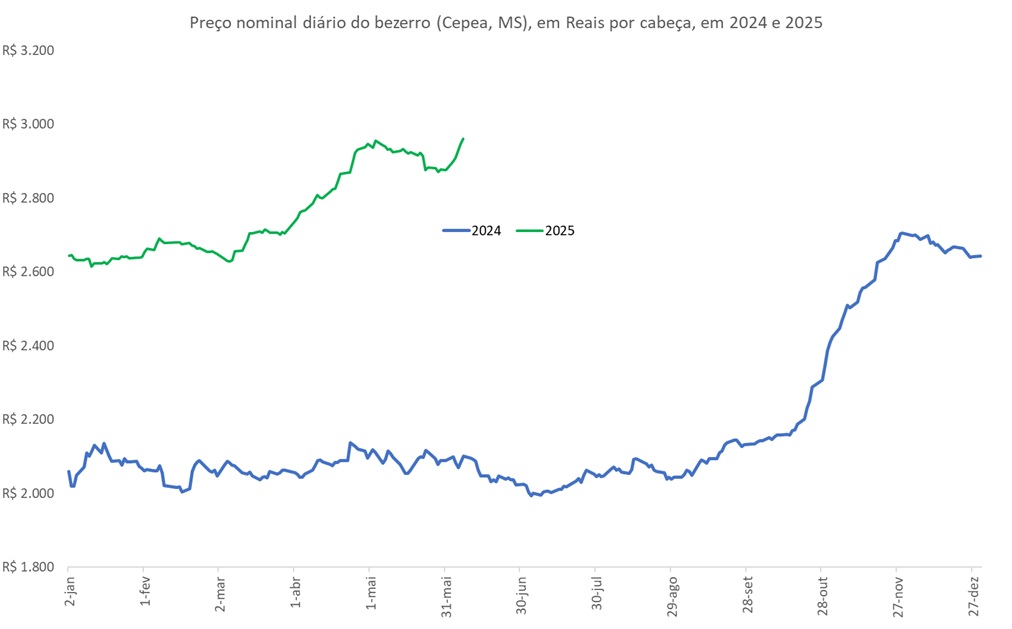 A Figura a seguir ilustra a evolução diária do preço nominal do bezerro (Cepea, Mato Grosso do Sul), em Reais por cabeça em 2024 e a parcial de 2025.