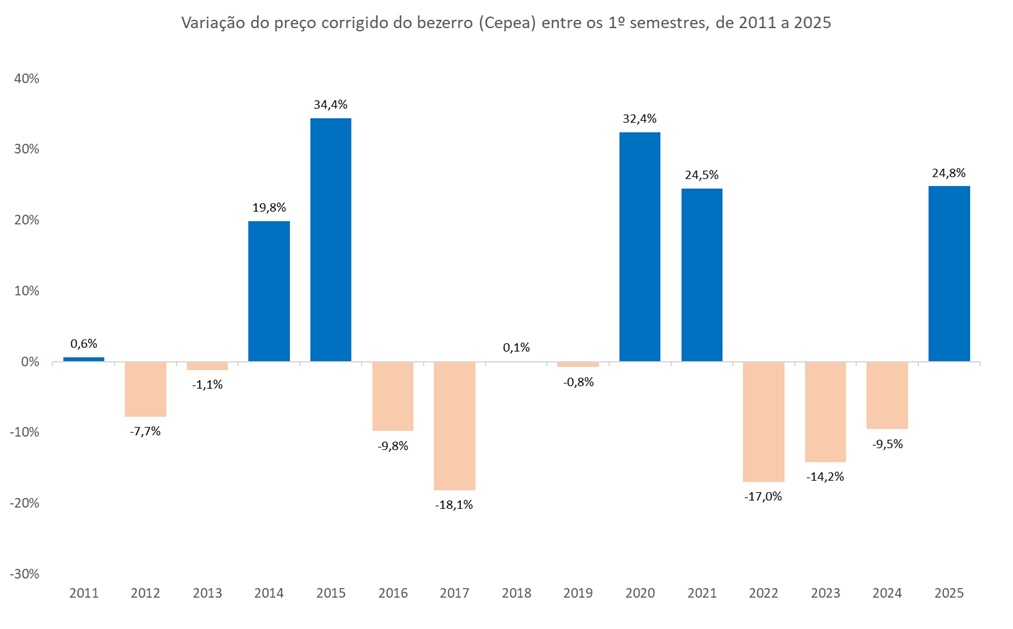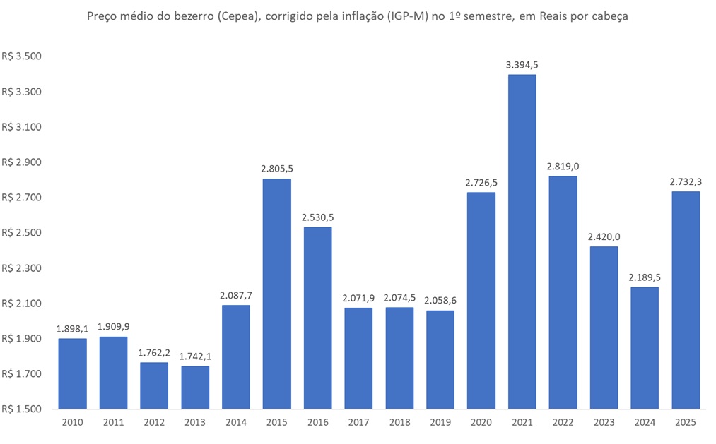 O preço corrigido do bezerro (Cepea, Mato Grosso do Sul) no 1º semestre de 2025 de R$2.732,3 por cabeça foi 24,8% maior que o valor praticado no mesmo período de 2024 e o maior para o período do ano desde 2022.