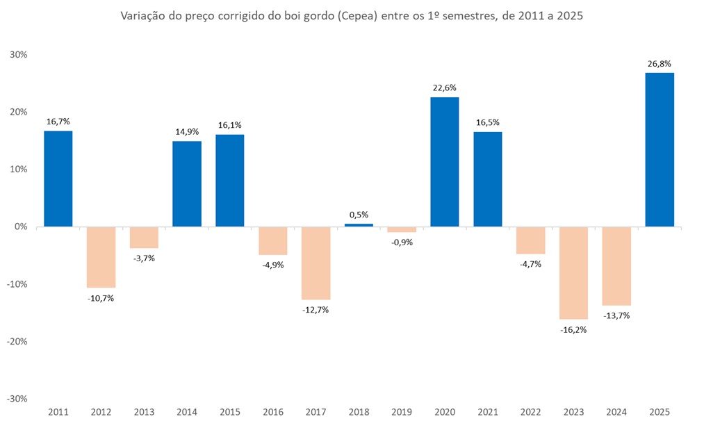 O preço corrigido do boi gordo (Cepea) no 1º semestre de 2025 de R$312,2 por arroba foi 26,8% maior que o valor praticado no mesmo período de 2024 e o maior para o período do ano desde 2022.