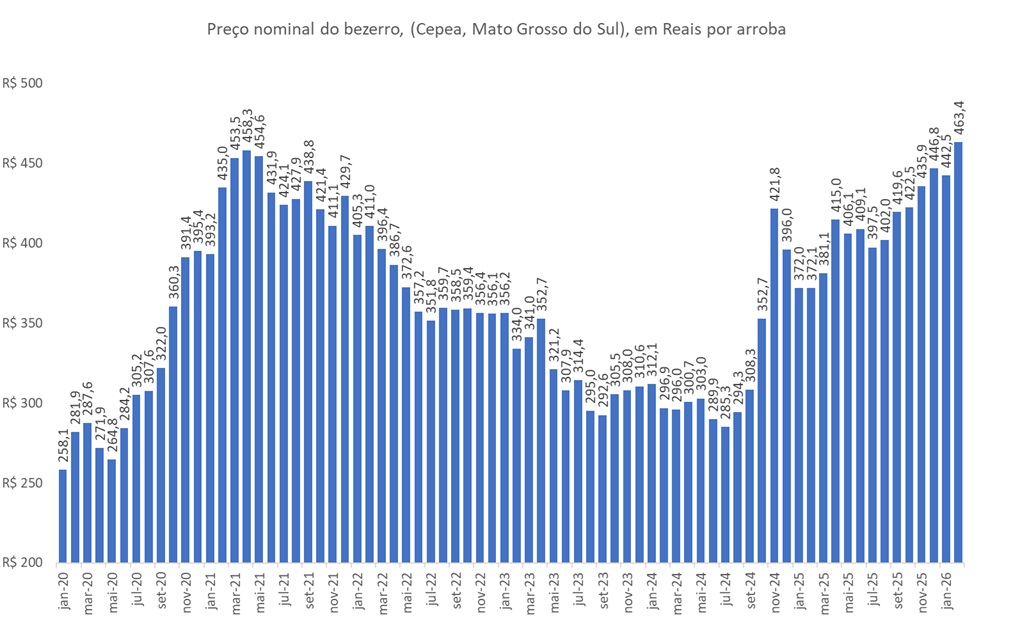 A Figura apresenta os dados médios do preço nominal do bezerro (Cepea, Mato Grosso do Sul), avaliado em Reais por arroba, entre janeiro de 2020 e a parcial de fevereiro de 2026 (até o dia 25).