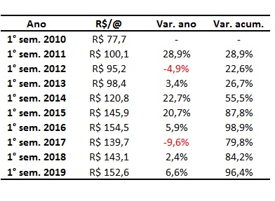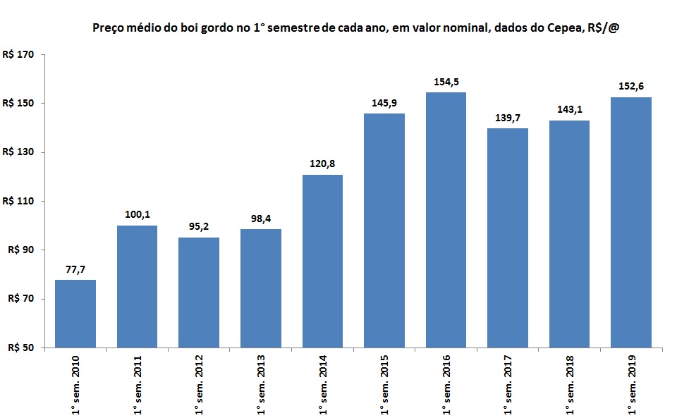 Vale destacar que a média de preços no 1° semestre de 2019 perde apenas para o valor praticado no mesmo período de 2016, quando o boi gordo foi cotado, em média, a R$154,5 por arroba.
