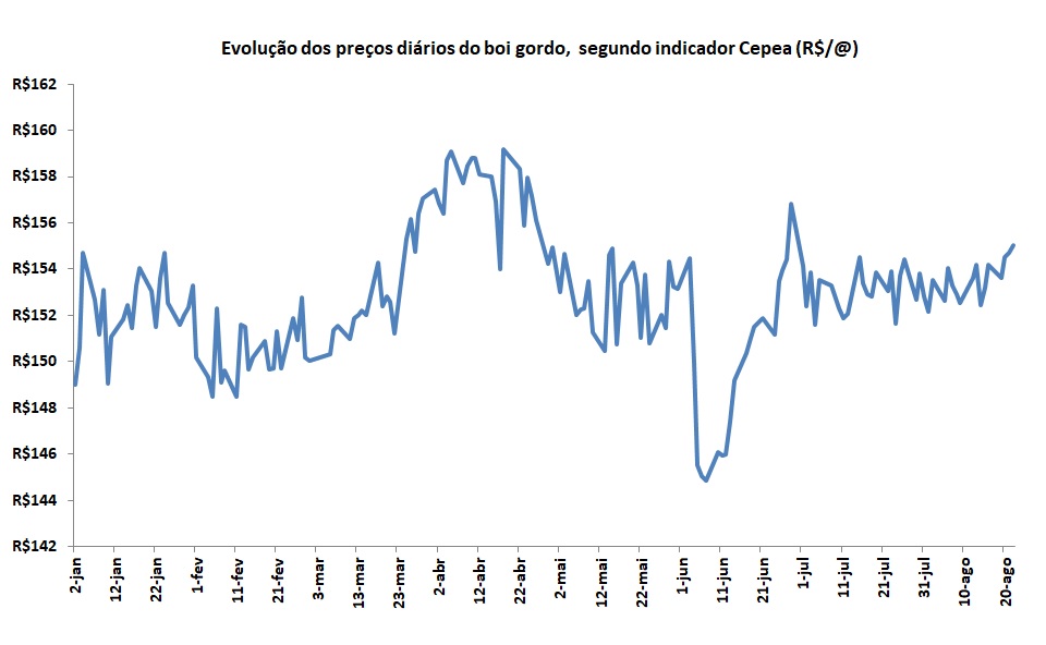 Isso porque no dia 22 de agosto o valor da arroba do boi gordo de R$155,05, segundo indicador Cepea foi o maior desde o final de junho, quando o alcançou a cotação de R$156,90 (28 de junho).