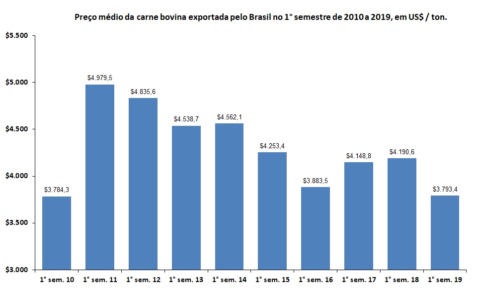 Isso porque a carne bovina brasileira foi negociada, em média, a US$3.793,4 por tonelada, o menor valor desde o 1° semestre de 2010, quando o valor médio da carne exportada do Brasil foi de US$3.784,3 por tonelada.