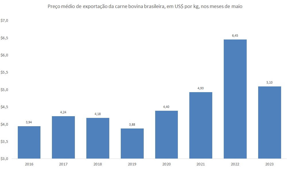 Apesar da queda em maio de 2023 frente a maio de 2022, o valor de US$5,10 segue acima dos valores praticados entre 2016 e 2021. Aliás, o preço médio da carne bovina exportada em um mês de maio, avaliado entre 2016 e 2023 foi de US$4,64 por kg, com o valor mínimo de US$3,88 por kg em maio de 2019 e o máximo de US$6,45 por kg em maio de 2022.