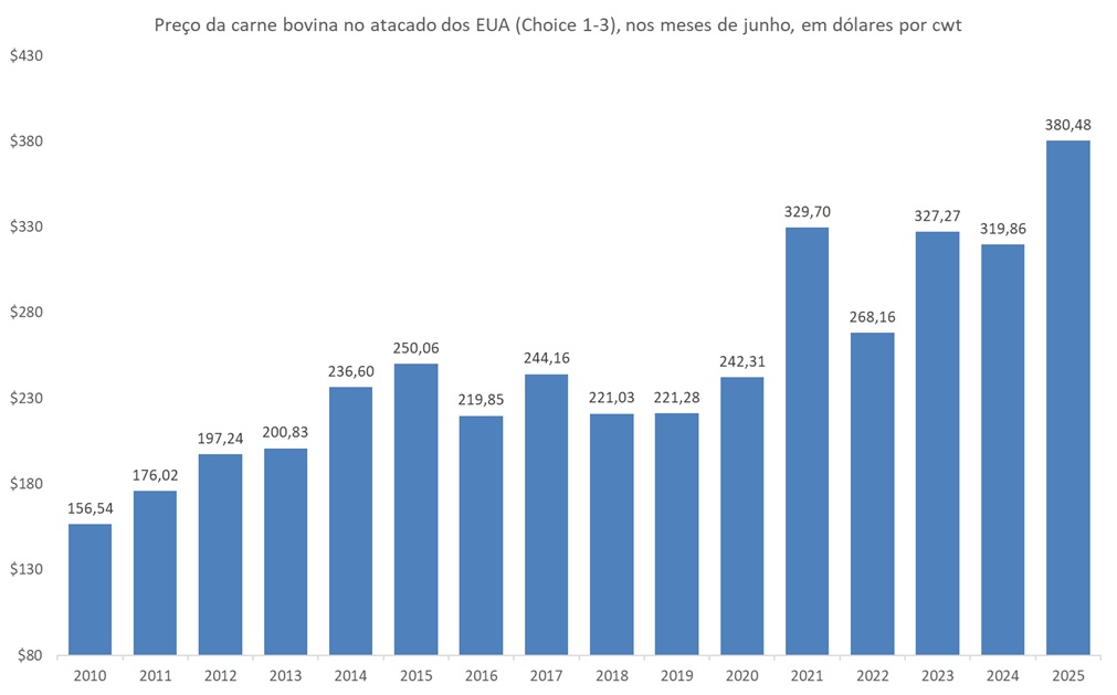 O preço da carne bovina no atacado dos EUA em junho de 2025 de US$380,5 por cwt ficou abaixo apenas do valor praticado em maio de 2020, quando no momento de incerteza diante do início da Covid-19 foi cotado acima de US$400,0 por cwt. Lembrando que a unidade de medida cwt ou hundredweight equivale a 112,0 libras ou 50,8kg.