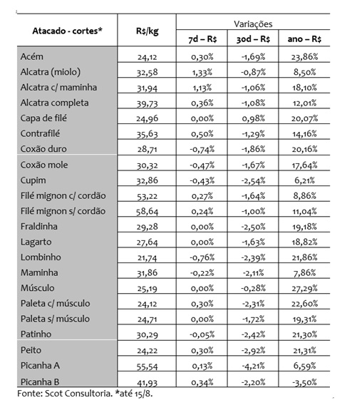 A Tabela apresenta os dados do preço médio dos cortes no atacado na primeira quinzena de agosto e, a respectiva variação semanal, mensal e anual.