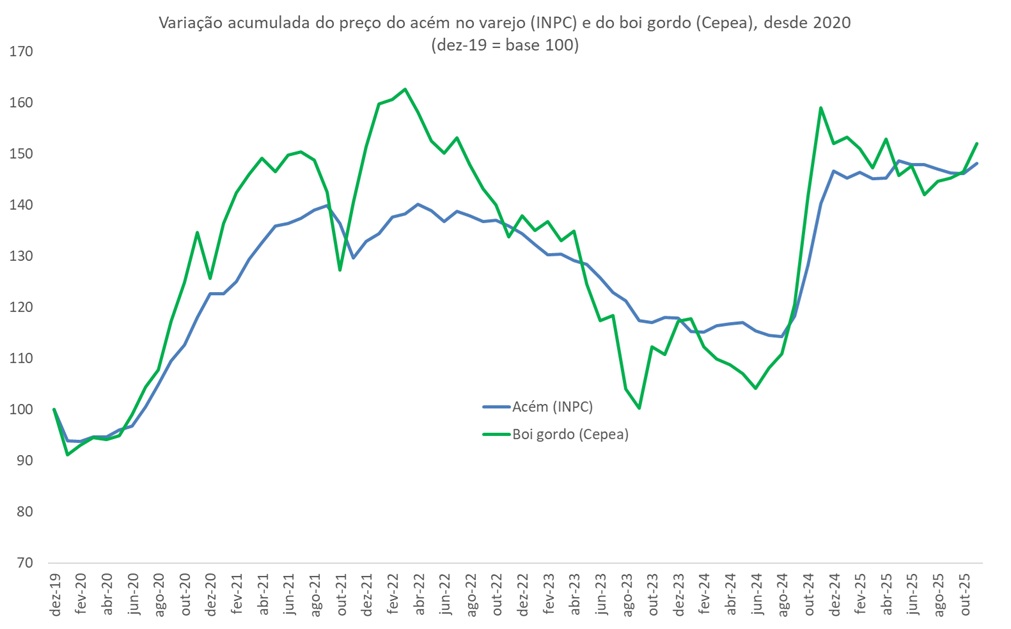 O fato é que considerando o valor de dezembro de 2019 como referência (base 100), o valor médio nominal do boi gordo (Cepea) acumulou, até novembro de 2025, alta de 51,9%, enquanto no mesmo intervalo de tempo a picanha no varejo (INPC) subiu menos (35,1%), como mostram os dados da primeira Figura.