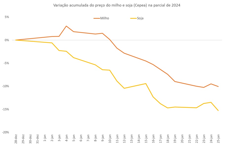 A Figura ilustra a variação acumulada do preço do milho (Cepea) e da soja (Cepea, Paranaguá-PR) ao longo de janeiro de 2024.