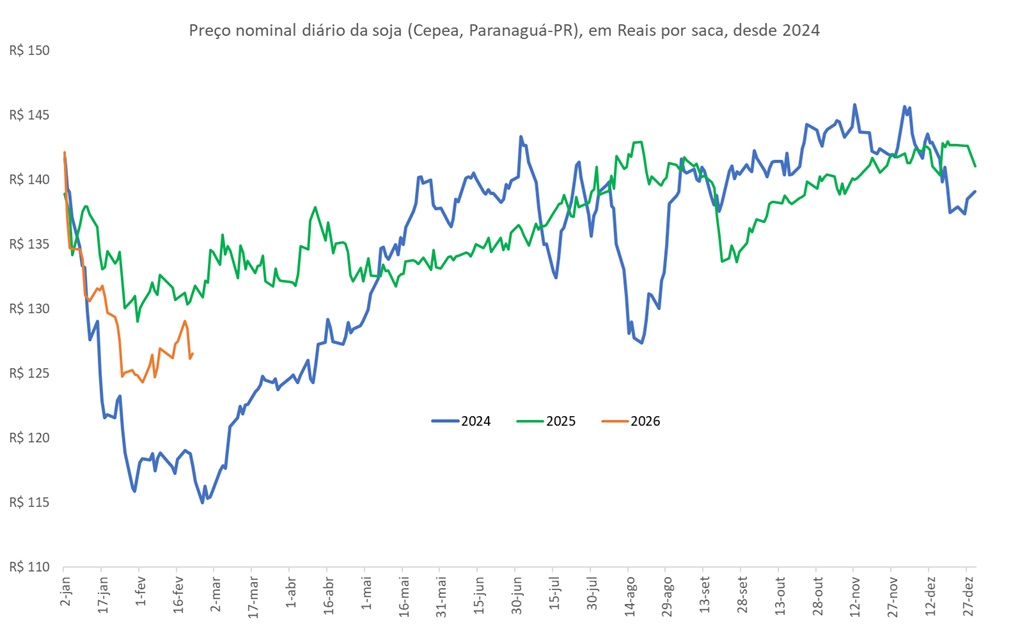 O preço da soja (Cepea, Paranaguá-PR) em dólares, na parcial de fevereiro de 2026 foi de, em média, US$24,2 por saca, valor 6,1% acima da média nominal de fevereiro de 2025 (US$22,8).